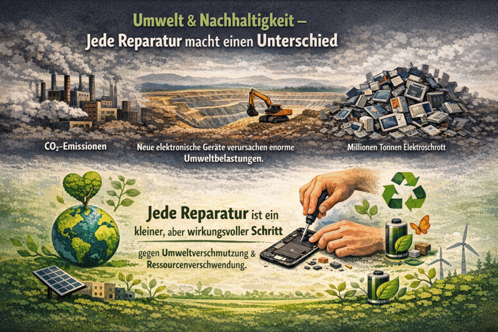 Umwelt & Nachhaltigkeit – Jede Reparatur macht einen Unterschied Neue elektronische Geräte verursachen enorme Umweltbelastungen — von CO₂-Emissionen, über den Abbau seltener Rohstoffe bis hin zu Millionen Tonnen Elektroschrott weltweit.Jede Reparatur ist ein kleiner, aber wirkungsvoller Schritt gegen genau dieses Problem.